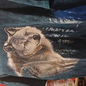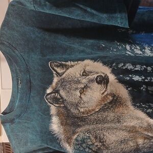 On the front, it has this beautiful wolf in its winter coat, peering through the trees with its golden eyes. All on this darker teal tie-dyed short sleeve t-shirt, size large. Very good quality tshirt 100% cotton and on the vintage "Harleguin Nature Graphics" tag.
