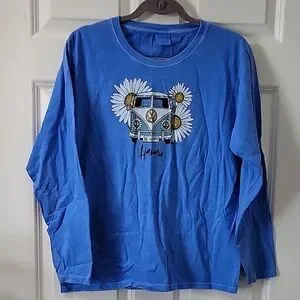 Crazy Shirts Hawaii Blue Long Sleeve Tee w/Floral Van Design Women Size Medium