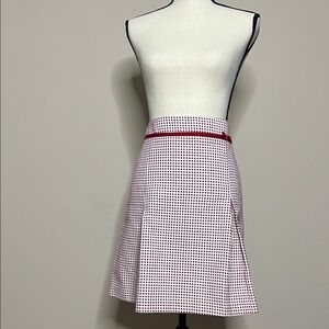 Elevate your wardrobe with this chic red and white polka dot A-line skirt. Perfect for any occasion, this skirt offers a stylish and versatile look. Has a ribbon on the left side for added classic fit. Zipper opening on the side.