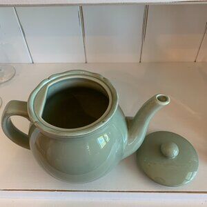 This is a beautiful celadon/moss green teapot with a scalloped rim. It is preowned. It has no chips or cracks. It holds approximately 6 cups. It measures approximately 9.5" tip of spout to end of handle, approximately 6.5" tall with lid on and the opening is approximately 3.5". It reads "A Tavola" Sedano. Dishwasher safe and microwave safe.