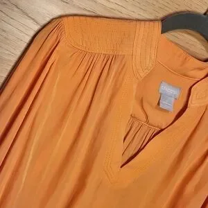 This Chico's 3/4 sleeve V-neck blouse features intricate stitching at the shoulders and is made from a lightweight silky fabric. It's so versatile! Looks great with a pair of white linen pants, your favorite jeans or dressed up with a pencil skirt and heels for a business appeal. It's so flowy and pretty.