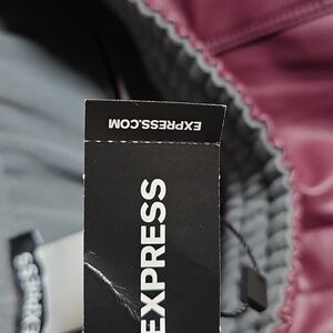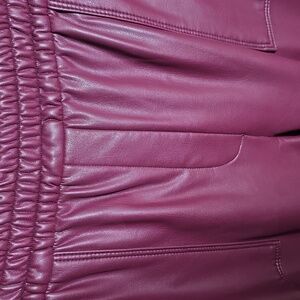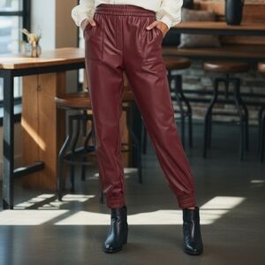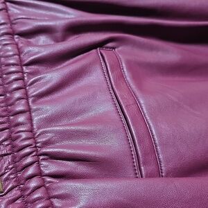 Express faux leather joggers in the most beautiful shade of burgundy wine are the perfect addition your wardrobe. Pull on style pant with elastic at waist and leg opening. Front and back pockets and faux fly detail. Lined in soft and cozy fleece thin fleece like material. Brand new with tags! These run oversized and roomy, adding to the chic appeal.