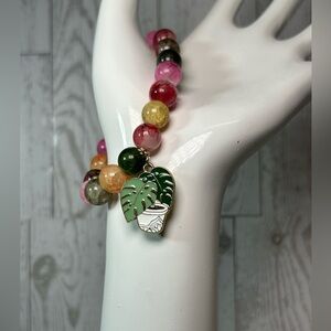 Elegant beaded bracelet featuring natural tourmaline stones in vibrant pink, green, and yellow hues. Adorned with a decorative silver-tone charm, this bracelet adds a colorful and sophisticated touch to any outfit. Each bead showcases the unique color variations characteristic of tourmaline gemstones.