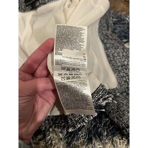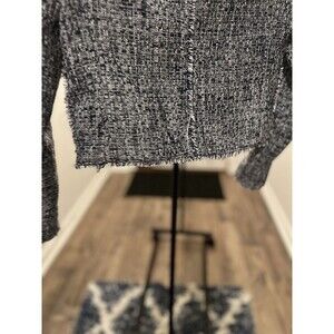 The Banana Republic Navy & White Tweed Zip-Up Blazer Jacket in size 00 features a classic black and white color scheme with a zip closure and long sleeves. Made from a blend of cotton, viscose, acrylic, and other fibers, it has a short length and a lined interior for added comfort. The jacket is suitable for various occasions such as travel, parties, casual outings, workwear, and business events. With a regular fit and Italian fabric theme, this blazer is a stylish and versatile addition to any wardrobe.