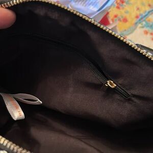 Beautiful butterfly print handbag with black handles and gold hardware. Has a zipper closure and a snap fastener on the front flap. The interior is black and has a zippered pocket. Brand new condition, never used. No shoulder strap.