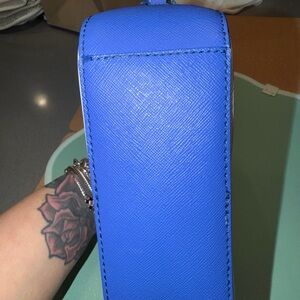 Features: Top zip closure, adjustable crossbody strap, gold-tone hardware, and one interior slip pocket.