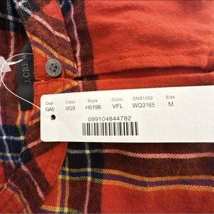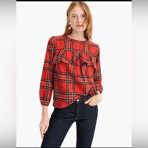 This is a long-sleeved, high-neck blouse featuring a classic red plaid (tartan) pattern. The design includes a distinctive horizontal ruffle or yoke detail across the chest. The fabric appears to be soft or flannel-like, and the sleeves end in gathered cuffs. The overall silhouette is loose or A-line, giving it a comfortable, slightly babydoll or peasant-style fit. The color palette is primarily red, with lines of green, blue, and yellow within the plaid. This blouse is perfect for the Fall and Winter seasons, especially around the Holiday time (Thanksgiving, Christmas, and New Year's). The plaid pattern and the rich red color are very festive and seasonally appropriate.