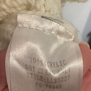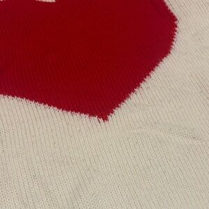 MainStrip size large cream and vibrant red sweater. 100% acrylic. Bold large red heart and red neck trim. Valentines vibe. Light piling under heart (see images). I did not use a fabric shaver on it. Chest 26 inches