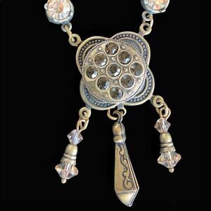 Beautiful vintage new old stock Banana Bob sample necklace in a lovely Edwardian style. The necklace features an abstract floral center with pave set citrine crystals, hanging from the center are three dangles 2 with champagne crystals and the center with an engraved teardrop, the pendant has large champagne crystals on either side which attach to the serpentine chain. Beautiful and elegant, measures 18” in length , the pendant is another 2”. Please see all photos for full description.