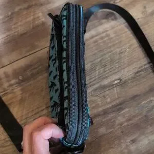 can be worn like a fanny pack, across the body or as a wristlet. comes with wristlet strap. used only a couple of times in great condition!!
