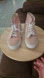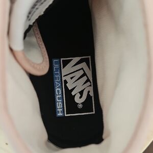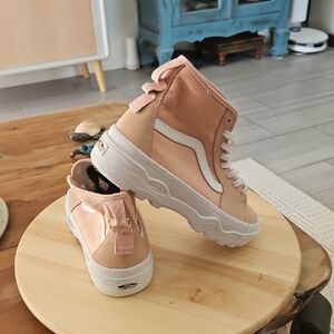 Chic Vans high-tops in blush. Features white accents and durable design.
