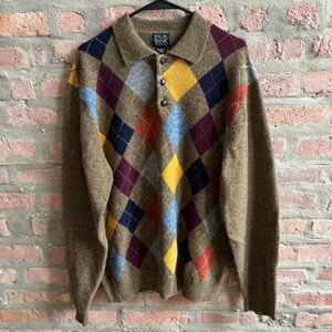 Classic brown argyle knit sweater from Jos. A. Bank featuring a button-up collar. Made from soft lambswool—warm, cozy, and perfect for layering. Timeless preppy / vintage vibe.
