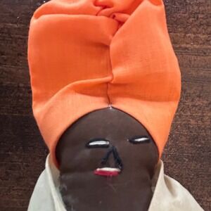 Keywords: rag doll, folk art, vintage doll, handmade doll, cloth doll, stuffed doll, collectible doll, ethnic doll, turban doll, orange doll, red doll, decorative doll, bohemian decor, retro toy, nursery decor