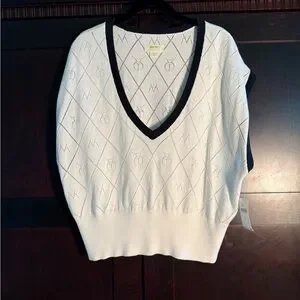 Chic white V-neck sweater. Features elegant black accents. Perfect for layering. NWT slight mark on back from store, should come out in the wash.