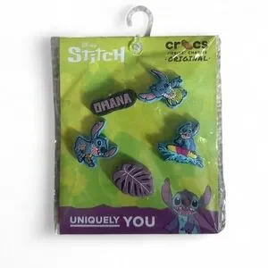 Fun Disney Stitch charms for kids' Crocs. Features playful designs in blue and purple. Perfect for personalizing shoes.