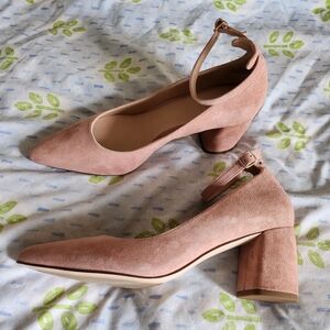 Elegant blush suede heels with a sturdy block heel. Only worn a couple times, almost no wear on bottoms. They are REALLY comfortable, but I don't have the dress I bought them for anymore.