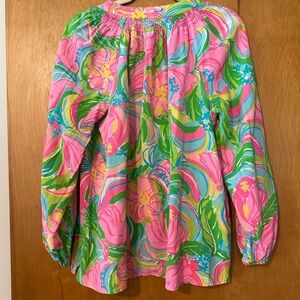 Add a splash of color with this Lilly Pulitzer blouse. Features bold pink and green floral patterns. Perfect for casual outings.