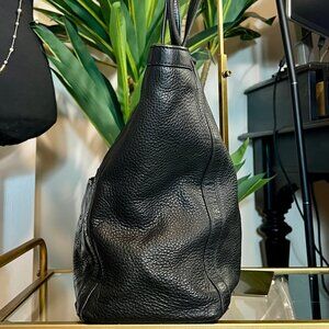 - BEAUTIFUL BLACK PEBBLED LEATHER WITH MATCHING SQUARE-LIKE TRIM, GOLD HARDWARE, AND WHO CAN MISS THAT OVERSIZED T LOGO.. THE HARDWARE LOOKS LIKE IT HAS NEVER BEEN TOUCHED BY HUMAN HANDS! THIS BAG IS INCREDIBLE! TOP 5 FOR ME!!