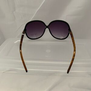NWT Tahari rounded black framed sunglasses. Brown marbled ears. Dark blue smoke lenses.