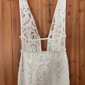 Chic white lace maxi dress with intricate patterns. Perfect for elegant events. Features a deep V-neckline.