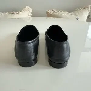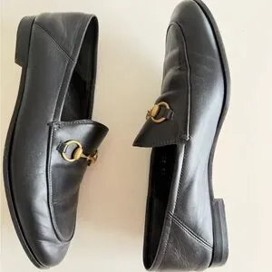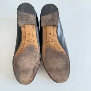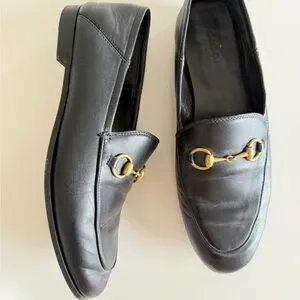 Chic Gucci loafers in black leather. Features gold hardware. Stylish and versatile.