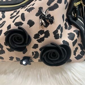 Preowned Betsey Johnson Color: Cheetah Black Flower Features: PVC Cheetah printed Exterior, Signature logo plate, 3-D roses and bee embellishment