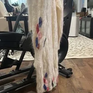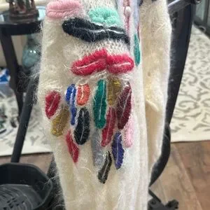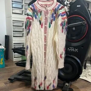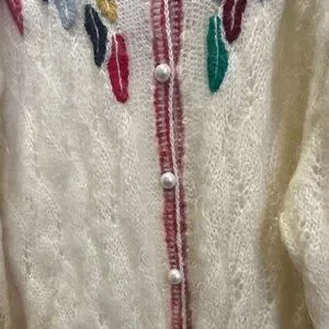 Embrace elegance with this women's cardigan featuring a multicolored feather pattern. The cream base is complemented by vibrant accents, perfect for adding a touch of color to your wardrobe.
