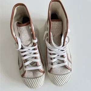 These trendy high-top sneakers feature a stylish white and brown design, perfect for any young fashion enthusiast. Comfortable and durable, they are ideal for everyday wear.