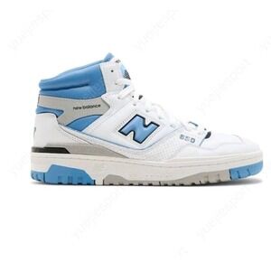 The New Balance 650 White and Blue High Top Heritage Blue BB650RCK in size 10M is a classic sneaker with a high-top silhouette, lace-up closure, and rubber outsole. It is designed for various occasions such as activewear, casual outings, and workwear, making it a versatile and stylish choice for men. The white and blue color scheme adds a touch of heritage to the shoe, while the leather upper and fabric lining provide durability and comfort. This athletic shoe is perfect for school or basketball activities, reflecting the brand's commitment to quality and performance.