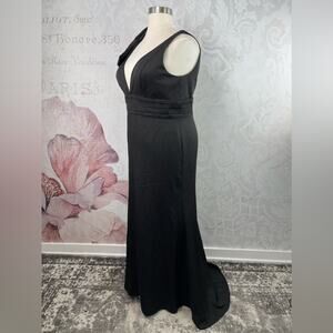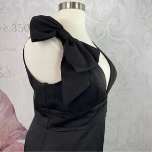 Elegant sleeveless gown with a plunging v-neckline, pleated waistband, asymmetrical bow-accented shoulder, and a sweeping train. New without tags.