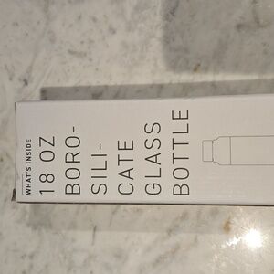 Glass beverage warer bottle with a natural wooden cap. Features La Mer logo silicone sleeve. New, never used. Box with some stains. Bamboo embellishment cracking.