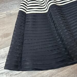 Elegant strapless Parker dress in black and ivory horizontal stripes with a sculptural sweetheart neckline and textural pleated hem. 100% silk shell with a lined interior. Smocked back for comfort and hidden side zip.