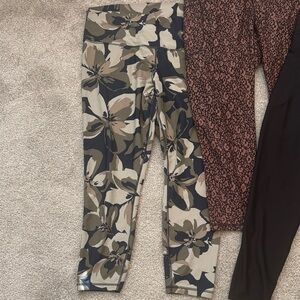 Set of three leggings. Includes solid black, brown with pattern, and green floral print. Comfortable and stylish.