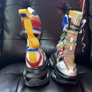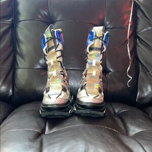 Stylish lace-up boots with holographic details. Perfect for a bold look.