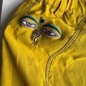 Kailas is a popular international brand. These pants are mustard yellow with blue stitching on the seams. They have some really cool embroidery as seen in the pictures. The waist is 13 inches but stretches to 15 inches. The inseam is 8 inches. The pants are 28 inches from groin to ankle. They are thin material made of 95% nylon and 5% spandex. Great if you like unique pieces, I just generally wanna look cool and have a funky style. The first few pictures are true to color. The ones with the measurements have different lighting and are not true to color. These are definitely mustard yellow.