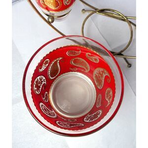 Stunning Vintage Red & Gold MCM Culver Red Paisley Ferris Wheel Bar Glasses & Ice Bucket / with metal carrier with wood handle as shown