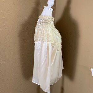 Stunning vintage cream satin blouse featuring exquisite lace detailing and classic Victorian / Edwardian-inspired design. Made in the USA from imported fabric, this romantic piece showcases delicate lace trim, a high lace neckline, and soft satin drape that catches the light beautifully.