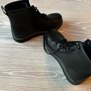 Sleek black leather boots. Durable lace-up design. Perfect for any occasion. Brand new, without box.