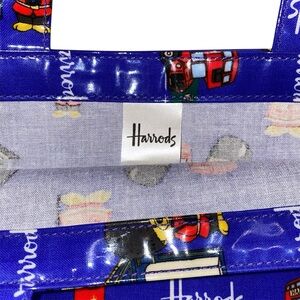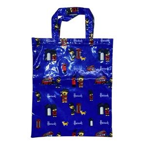 Harrods vibrant blue tote bag featuring iconic London designs with Harrods branding and teddy bears. Made from a PVC shell and cotton inner lining. Measuring approximately 13.5" tall by 11" wide. Clean and in excellent condition with no notable flaws (never used), just a little crinkly from being stored