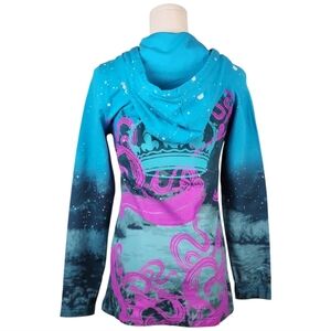 Make a bold statement in this Crystal Rock by Christian Audigier Limited Edition Hoodie in a stunning ombré aqua blue with striking pink and purple graphics. This rare, collectible zip-up hoodie is a true Y2K gem, featuring eye-catching rhinestone embellishments and exclusive artwork on soft, stretchy 95% cotton and 5% spandex fabric.