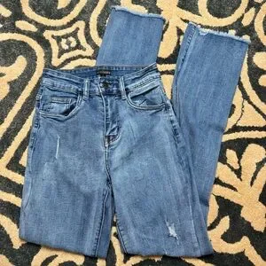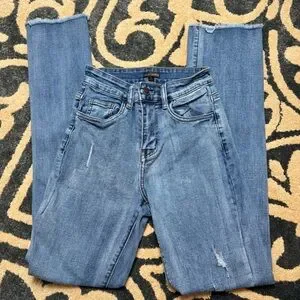 Timeless straight leg jeans in a classic blue. Features subtle distressed details. Perfect for casual wear. I can’t tell if the line in the 5th photo is an irregularity in the denim but its not noticeable unless under a bright light