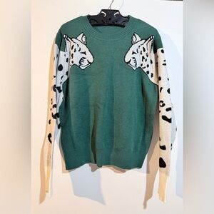 Stylish green sweater featuring a bold leopard design on the sleeves. Perfect for a unique and trendy look.