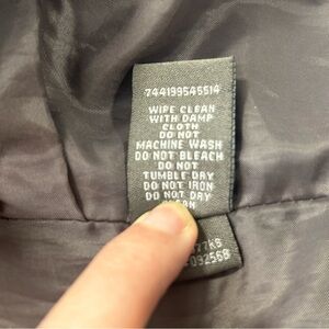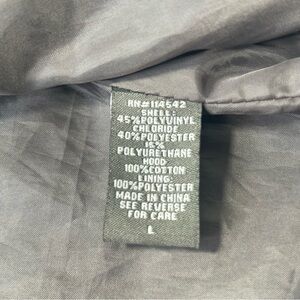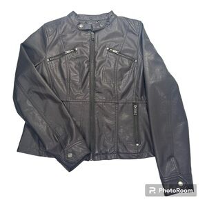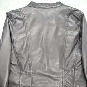 J2 Vegan Leather zipper front mid-length jacket, color gray, that has a biker/motorcle feel, perfect for travel and casual use w/2 breast zip pockets & 2 side zip pockets, snap detailing at the collar and cuffs, 100% polyester lining and stand up collar, size Large Women's. Please see attached J2 size chart for measurements associated with size Large. Jacket is gently used in very good condition.