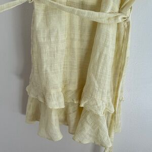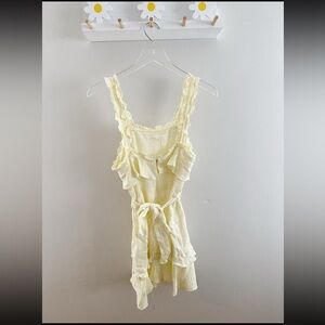 Lovely Étophe Studios yellow ruffle mini dress featuring a soft cotton-gauze texture, tiered skirt, and feminine square neckline. Adjustable tie waist for a flattering fit and ruffled straps for added detail. Lightweight, airy, and perfect for spring and summer outings, vacations, brunch, or warm-weather events.