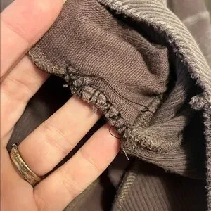 Chic and relaxed V-neck sweatshirt. Perfect for casual outings. Soft fabric for comfort. Color is a dusty purple/brown. Material is not a thick sweater material but more like a shirt at some sections. Has been sewn under armpit, but when worn not noticeable.
