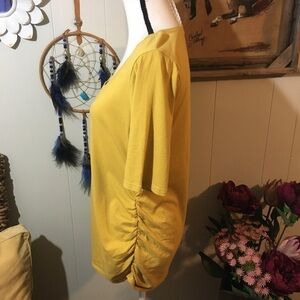 Cute elastic gathering on the side. Short sleeves round neckline. Gently preowned condition. See photo for material details