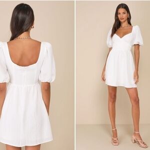 You can call it a crush, but we're falling hard for the Lulus Little Bit In Love White Surplice Puff Sleeve Mini Dress! Lightweight crinkly woven fabric sweeps across an overlapped surplice bodice and short puffy sleeves with elastic cuffs. High waist top a flaring mini skirt. Hidden back zipper/clasp.