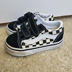 Stylish and comfortable kids shoes with a trendy black and white checkered design. Perfect for everyday wear. Alittle wear, rubber can be cleaned. Some threading visible on straps.