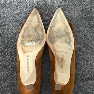Manolo Blahnik Maysale Suede Buckle Kitten Heel Pumps Cognac Brown Size EU 38