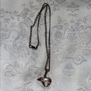 Rare vintage Sterling Silver elegant inlay necklace features a unique chain with a stunning pink & silver Bear pendant. The technique involves precisely cut and fitted stones or other materials set into a silver base to form a mosaic pattern The pendant is shaped in the silhouette of a bear, an animal highly regarded in the Native American culture, symbolizing strength, power, and healing. The inlay appears with a white material, which could be mother of pearl or opal & a pink magenta material with pink spiny oyster shell or synthetic pink opal. Perfect for adding a touch of sophistication to any outfit. 20”. Pendant is 1” wide. In mint condition. Smoke & pet free home.